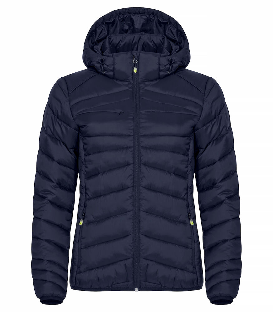 En varm och lätt jacka med dunliknande vaddering. Tillverkad av 100% återvunnen polyamid. Avtagbar huva, tre ytterfickor med dragkedjor och två innerfickor. Elastiskt avslut i nederkant samt ärmar. Utrustad med färgade zippullers, hörlurslösning och dragkedja., Skal: 100% återvunnen polyamid. Vaddering: 100% återvunnen polyester. Foder: 100% återvunnen polyester, Dam, Mörk Marin. RecycledMaterials. Clique