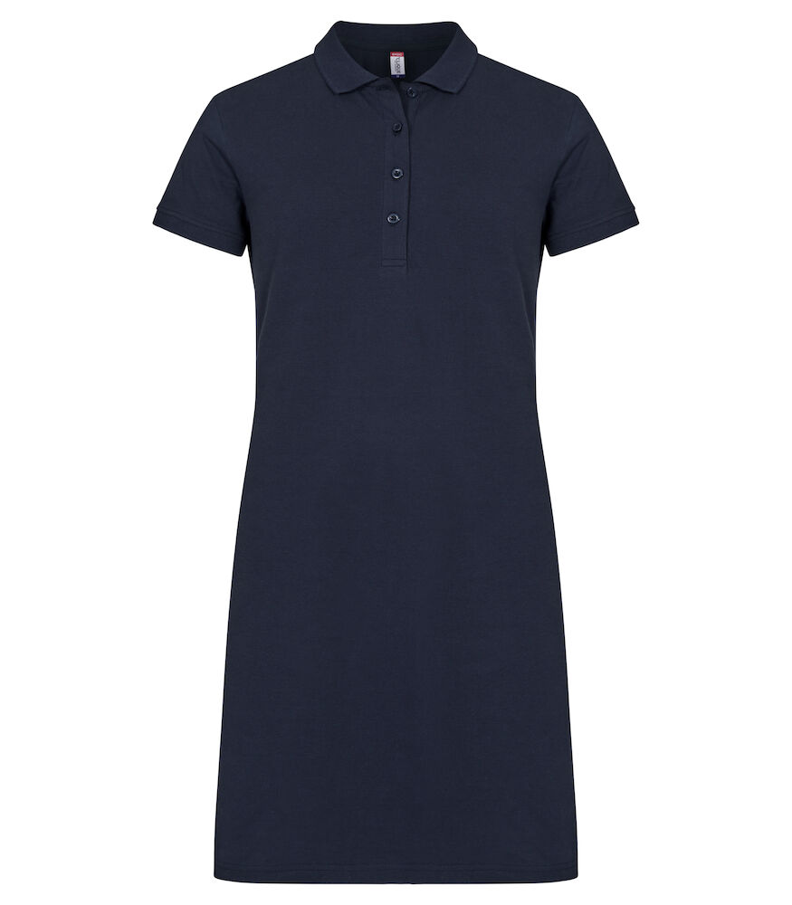 En tidlös poloklänning. Sidoslitsar och fyra ton-i-ton knappar. Förstärkt nackband och en lätt avtagbar nacketikett för enkel ommärkning., 100% bomull, Dam, Mörk Marin. OekoTex. Clique